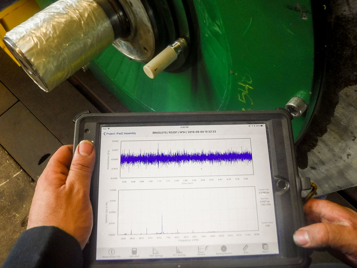 When a problem occurs, it is critical to quickly identify the source and take corrective action. Bradleys’ vibration analysis device is a portable, route-based instrument used for collecting vibration data on rotating machinery. Bradleys’ CSI-2130 device is a portable, route-based instrument used for collecting vibration data on rotating machinery. It reduces collection time by more than 50 percent, compared with similar devices. This allows Bradleys to determine the severity of the stress level of bearing or gear wear on your motor. The data is recorded from each machine and uploaded on the software, providing quick recognition of change in the vibration pattern, as an indicator of deterioration. Corrective actions are then taken.