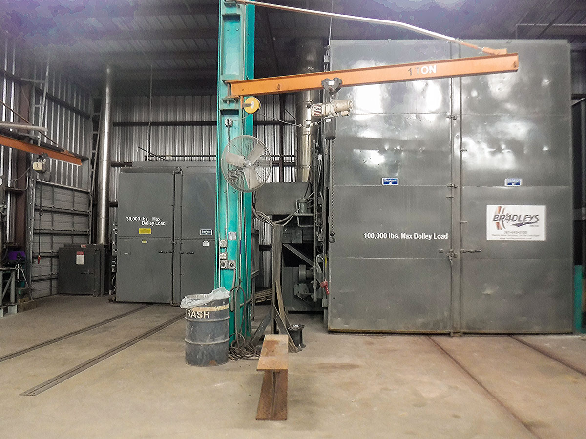 16’ x 21’ x 14’ Burn Out Oven Overview: From cleaning stators and windings to reclaiming coated parts, removing plastics from screws and the safe removal of rubber, Bradleys’ utilizes our Steelman heat-cleaning oven. In our burnout oven, varnish, epoxy, paint, grease, rubber and other combustible materials are removed from metals. Bradleys’ burnout ovens have a high-fire afterburner that breaks down and eliminates any chemical residues or VOC fumes that could be released into the environment. Bradleys makes every effort to protect our fragile coastline. Our goal is to exceed your expectations.